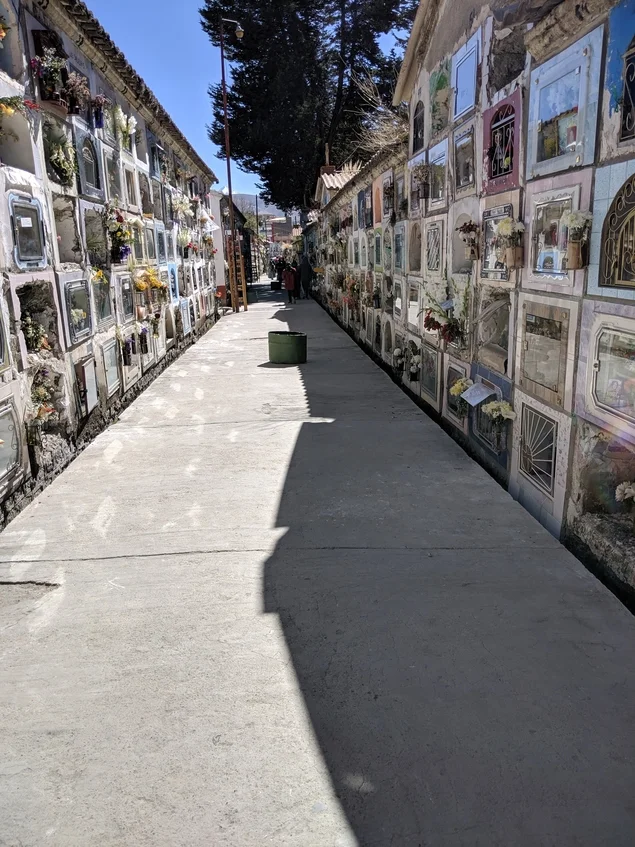 Our first stop on our line was the General Cemetery of La Paz. This was very interesting for a couple of reasons. The first being that the cemetery functioned as a public park as opposed to a place of mourning. It is so large that people walk through it to get from one area of the city to another. They might eat lunch inside of it or simply walk among the rows. We started walking through the cemetery for the “lower” class individuals. It is just rows of boxes/coffins stacked on top of each other. Each box can be filled with items, pictures, flowers, or whatever else the family deemed important to that person. The oddest, but admittedly funniest thing we saw, was a woman on a ladder lighting a cigarette and placing it in her person’s box.