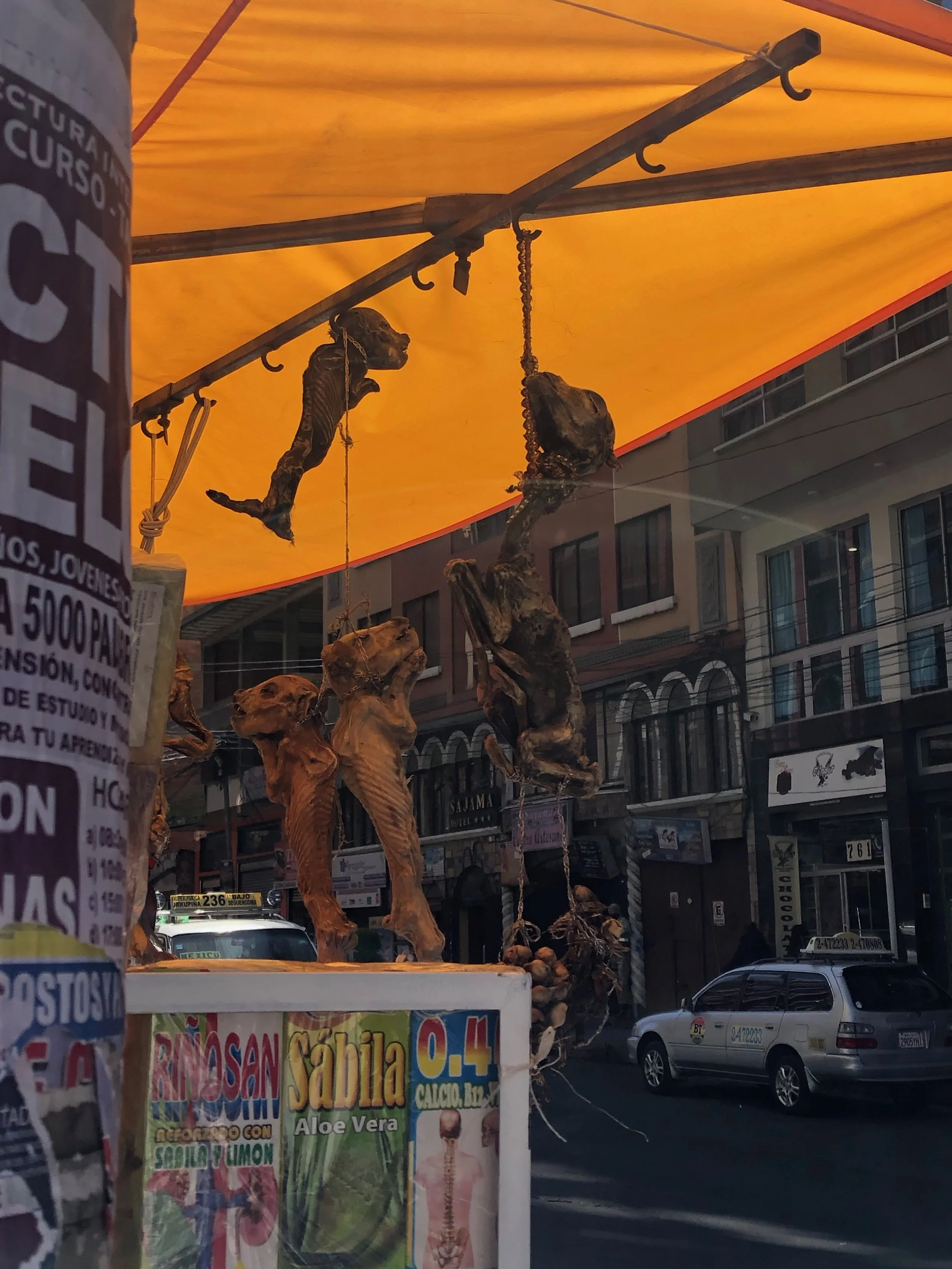 Immediately outside the cemetery, was a very long and active protest happening. Since they were going in the direction we wanted to be going, we followed (at a safe distance) to the Witches’ Market. The market has all kinds of potions and spells that can help you with any problem you might have, whether that be to bring luck, love or solve fertility and money problems. You can buy snakes, naked statues of couples, dried frogs and turtles, aphrodisiacs, owl feathers, armadillos and oddly-shaped black candles. Probably the most haunting object you will encounter (there is no way around it) is dried llama fetus. We did learn that in order for these llama fetuses to have strong powers, they need to be ‘naturally occurring’ — i.e. they aren’t hurting or killing the llamas for fetuses, they come from problematic births.